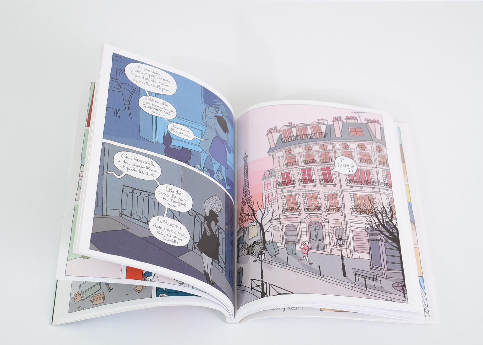 Un joli petit livre dans lequel on retrouve les couleurs de Pénélope Bagieu, en passant du kaki au rose pâle, du bleu indigo au violet éclatant et tout cela suivant les humeurs de l'héroïne. On retrouve également le plaisir des expressions de ses personnages sublimées par son trait toujours aussi captivant et agréable à lire. Je me suis aussi régalée de son goût pour les détails des décors. (Il faut dire que je passe beaucoup de temps à contempler, voire "lire" le moindre détail de chaque page, car j'aime les détails). Que ce soit à travers la présence de personnages "lambda" en fond ou d'objets dans une pièce, chez Pénélope, on s'y croit et on entre dans l'univers du personnage comme si on y était vraiment!